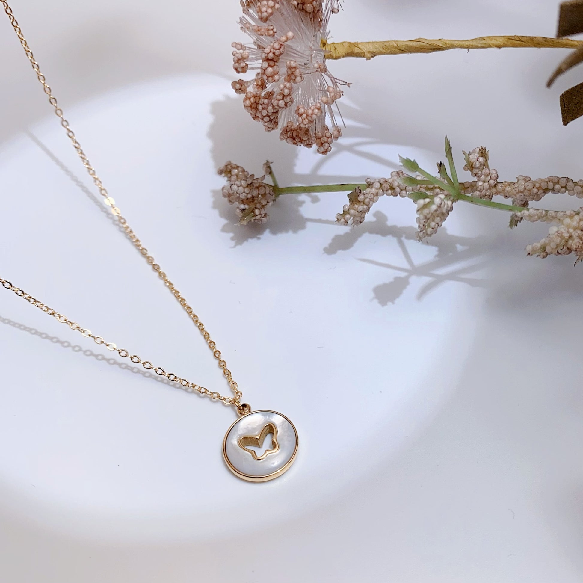 Bring a soft touch of nature to your everyday look with this butterfly pendant necklace. Featuring a delicate gold butterfly set in a round mother-of-pearl charm, this piece glows with subtle shimmer and grace.